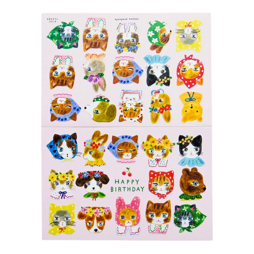 Elevate birthday greetings with this exquisite Aiko Fukawa birthday card, an essential addition to your stationery collection. The beautiful rendered illustration depicts rows of cute cats, pups, and other animals in festive attire. Complementing this special card is a lovely envelope adorned with a smattering of gold foil hearts, ensuring your sentiments arrive with distinction.