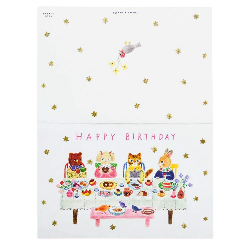 Elevate birthday greetings with this exquisite Aiko Fukawa birthday card, an essential addition to your stationery collection. The beautiful rendered illustration depicts a group of animal friends at a sweet little celebratory soiree. Complementing this special card is a lovely envelope adorned with a smattering of gold foil stars, ensuring your sentiments arrive with distinction.