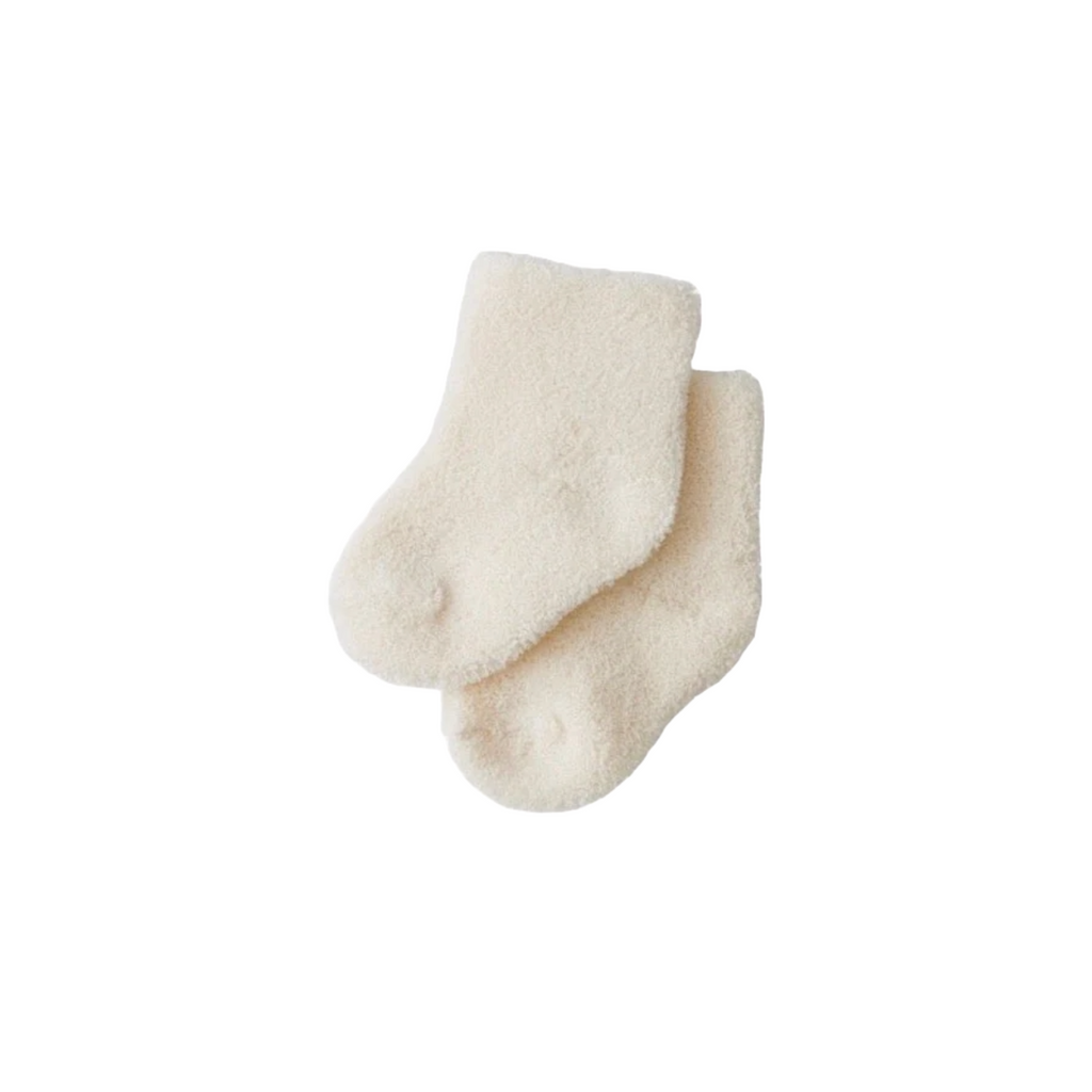 These charming cream-colored baby socks, crafted from terry loop cotton, are essential for newborns. Designed to gently cradle delicate feet, they offer warmth and protection with a luxurious softness. The added stretch ensures a comfortable fit that adapts as your little one grows.
